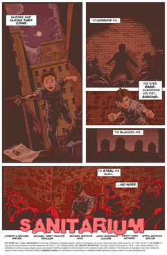 Cover: Mike "MEZ" Phillips and John Anderson Writer: Joseph A. Michael Pencils: Mike "MEZ" Phillips Inks: Michael Watkins Colors: John Anderson Letters: Kenny Keen SANITARIUM This is the story of the dreams and reality of one man clashing together. A 20 year resident of the Oarthman Institute For The Mentally Unstable, Jayme Spire was the only witness to a massacre that took the lives of his family as well as the ones who slain them. Since that night Jayme has only been able to verbally communicate with the words No More. Most believe this to be his way of dealing with his grief but in actuality it is his vengeance. His ability to project his consciousness away from his body and reconstitute it in the form of an unnamed hooded vigilante that has no sense of control.In his time at the institute his treatments by Dr. Redd, could be called boardline torture. His only saving grace is a young nurse, Rosalyn Khan, who has been watching over him in the hopes of being able to connect with him and maybe someday be able to show Jayme what today's world has to offer.